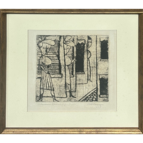 Otto Lange (1879 - 1944) - Sem título, Mulheres na rua - ponta seca sobre papel - 39 x 32,5 (área impressa) - assinada canto inferior direito - 1921. Participação: Exposição Verdade - Fraternidade - Arte - Secessão de Dresden, Grupo 1919 e Contemporâneos, Museu Lasar Segall, 2011. Reprodução: página 123 do catálogo da referida mostra.