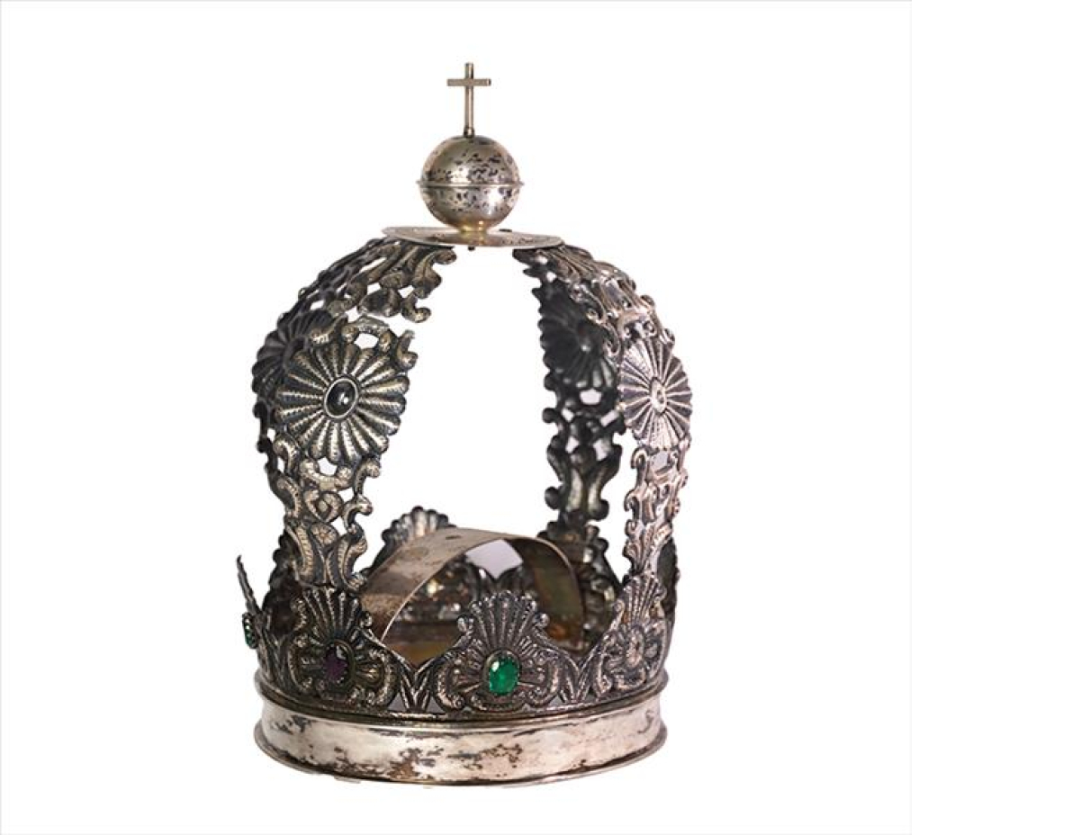 Importante coroa de prata-de-lei regional, sem contraste, ricamente cinzelada, ornamentada com ramagens, volutas e rosáceas, inclui cabouchons de gemas possivelmente esmeraldas e ametistas polidas.