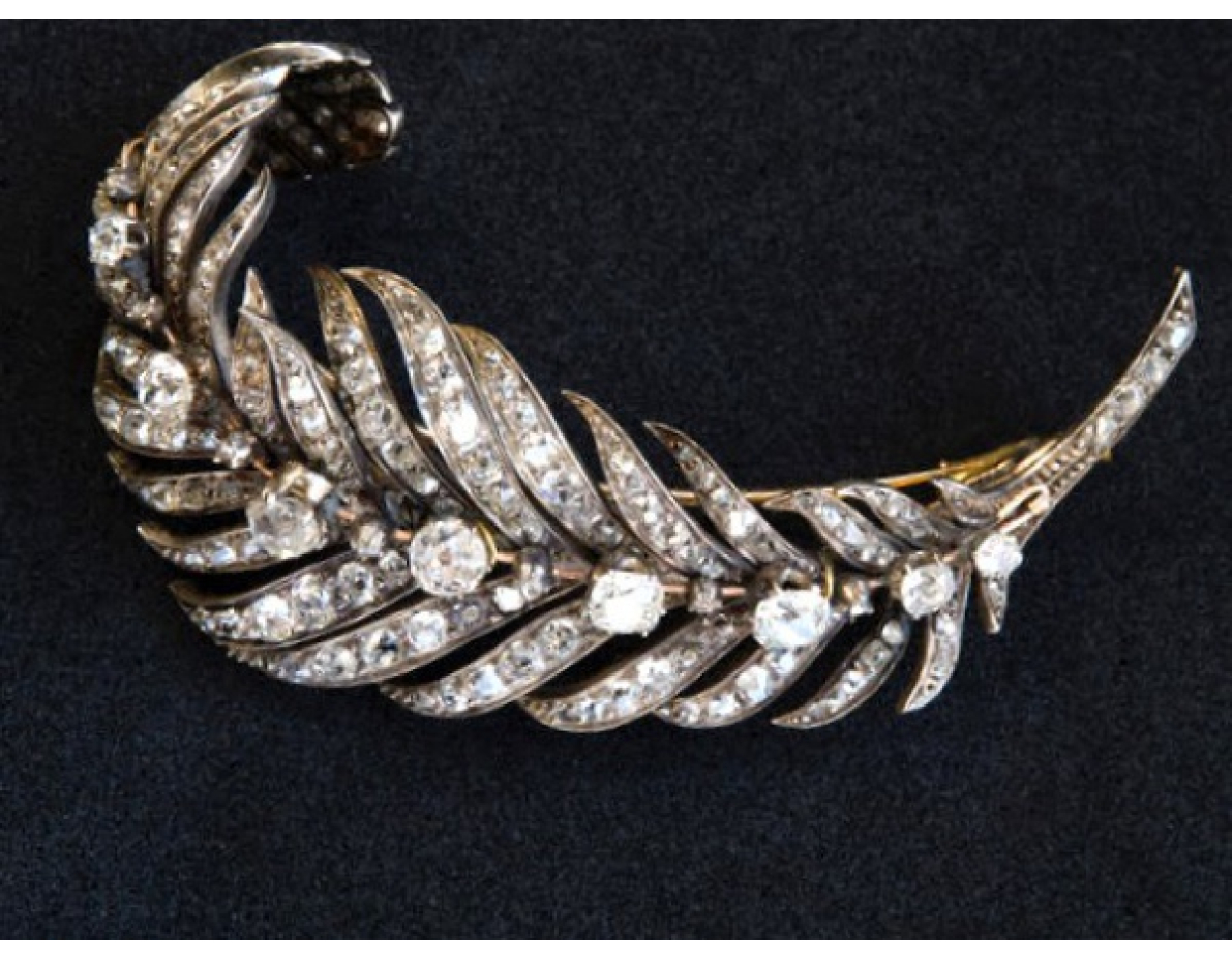 BROCHE FOLHA CERCA 1840 EM OURO 18K E PRATA COM DIAMANTES CUSHION CUT MAIORES DE APROX 2,40 QUILATES TOTAL + DIAMANTES CUSHION CUT MENORES DE APROX 3,20 QUILATES TOTAL.