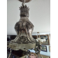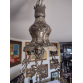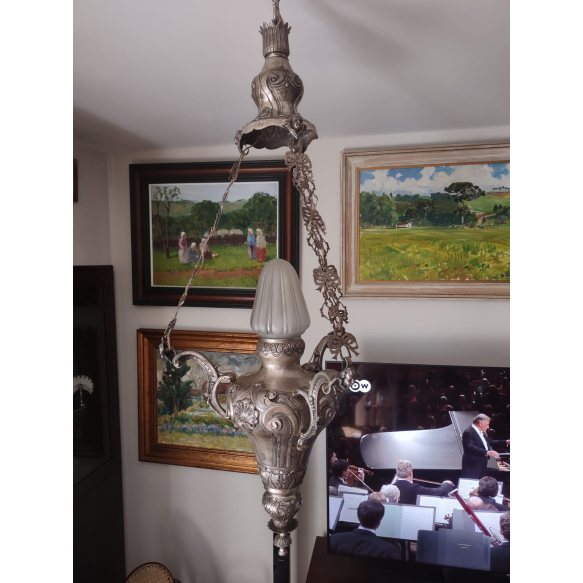 Lampadário de prata repuxada e cinzelada, ornamentado por cabeças de anjo, reservas, concheados, volutas e folhagens, séc. XIX, marcas de prateiro, altura total aprox. 105 cm, peso total aprox. (prata) 4.850 g