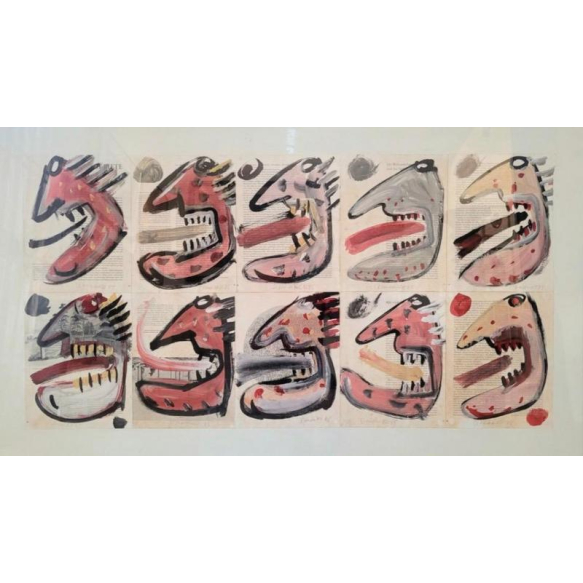 Luiz Henrique Schwanke - Série "Os Linguarudos" - Pintura sobre papel - 10 peças com medidas de 28 x 34 cm totalizando painel de 68 x 140 cm - Todos assinados