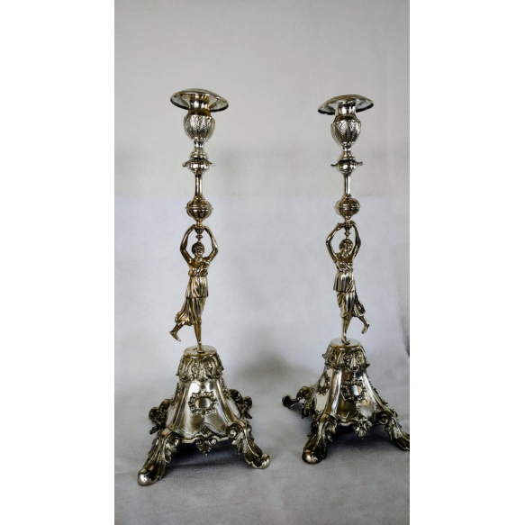 Importante par de castiçais portugueses em prata de lei, apresentando contraste Javali, utilizado em Portugal no século XIX, acompanhado de marca de ourives junto à fixação da figura. As peças apresentam figuras femininas escultóricas sustentando o fuste, com bases amplas e ricamente ornamentadas em relevo, revelando um trabalho de elevada qualidade artística e técnica.Execução historicista (rococó revival), com fundição, montagem e cinzelagem manual, característica da grande ourivesaria portuguesa do final do século XIX. Medidas:Altura 38 cm. Peso: 1.600 g - Alto colecionismo: manufatura Portugal século XIX