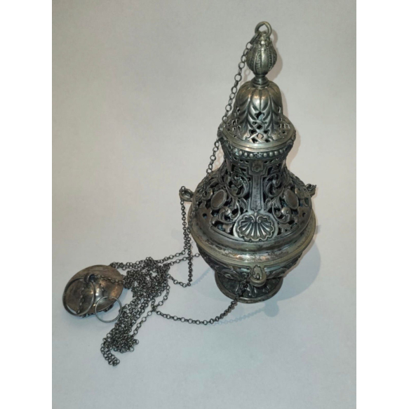 Magnífico turíbulo (incensário litúrgico) em prata de lei portuguesa, contrastado com “P coroado”, apresentando elegante corpo vazado com rica decoração barroca tardia, volutas, elementos fitomórficos e tampa perfurada, conservando correntes originais. Peça de grande qualidade artesanal, produzida para uso eclesiástico, representativa da ourivesaria portuguesa do período tardo-barroco / proto-neoclássico. Altura do corpo: 28 cm - Comprimento total com correntes: 110 cm - Peso: 764 g