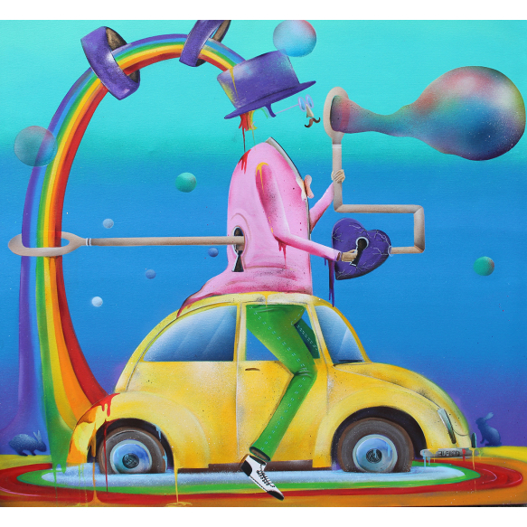 Alemão - Homem e seu fusca azul - Óleo sobre tela - 90 alt x 90 larg (cm) - acid e verso -Registrado pelo Atelier do Artista sob número 01077.
