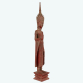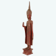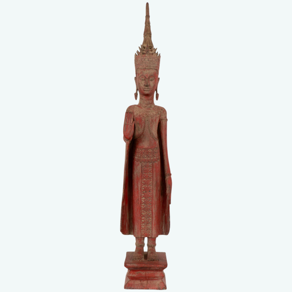 Buda em pé, esculpida em madeira antiga e pintada de vermelho. As esculturas de buda, como esta, são símbolos importantes do Budismo e representam a busca pela iluminação e a promoção de valores como paz e o amor. séc. XX. Dimensões: 100 x 15 x 15 cm.