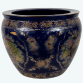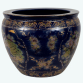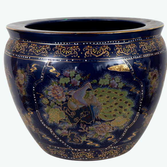 Grande vaso em forma de bowl decorativo oriental confeccionada em porcelana policromada, decorada com esmaltes pintados a mão em relevo e realces a folha de ouro, galeria central com "paisagem" e decoração floral. Dimensões: 35 x ø42 cm.