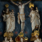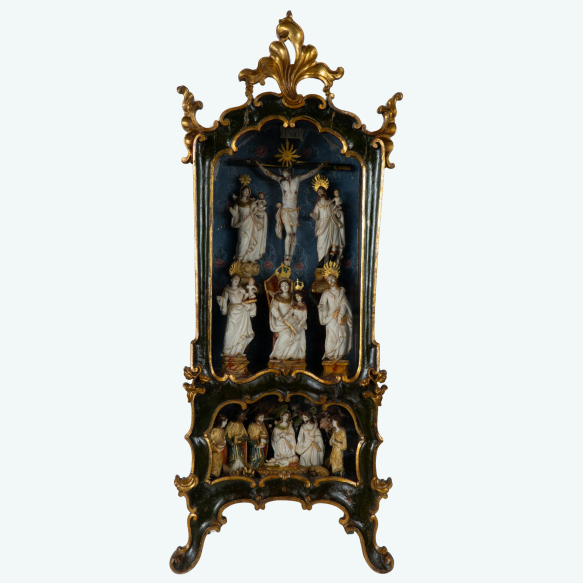 Raro e excepcional oratório brasileiro dito "lapinha", construído em madeira de concepção barroca, entalhada, policromada e realçada a ouro com volutas ao topo. Interior com o crucificado rodeado por outros 6 santos de devoção em pedra sabão. Na parte inferior representação da adoração ao Menino Jesus. Uma das melhores peças deste tipo já vistas no mercado. Peça de coleção. Minas Gerais, Brasil, séc. XVIII. Dimensões: 82 x 33 x 18 cm.