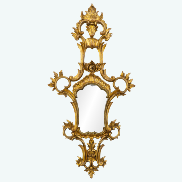 Belíssimo espelho barroco italiano em madeira ricamente entalhada e vazada decorado com flores e folhagens brunido a folha de ouro fino. Itália, séc. XVIII/XIX. Dimensões: 100 x 51 x 3 cm.