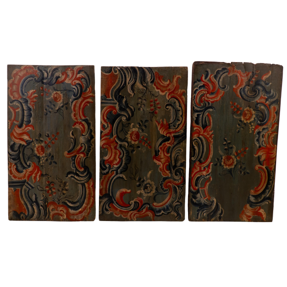 3 painéis | fragmento de teto de igreja em madeira policromada com fundo azul turquesa decorado com motivos florais e vegetalistas, muito característico da época. Brasil, séc. XVIII. Dimensões: Painel I: 116 x 66 cm; Painel II: 120 x 66 cm; Painel III: 117 x 66 cm.