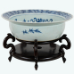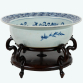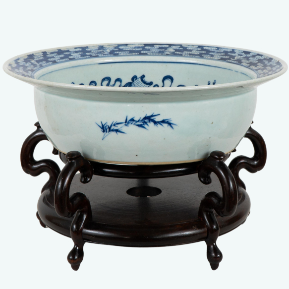 Rara bacia em porcelana chinesa da Cia. das Índias, dinastia Qing, reinado Jiaqing (1796-1820) e decorada em esmaltes a azul e branco. Decorado com símbolos sagrados e kirins. Sobre a aba, anéis sobre fundo azul. Peça de uso interno com pintura e esmaltação de alta qualidade, não destinada à exportação. A presença de nuvens e kirins remete à simbologia chinesa mitológica. Peça de coleção. China, séc. XVIII/XIX. Dimensões: 13 x ø35 cm (Base: 15 x ø32 cm).