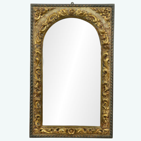 Espelho com moldura barroca, colonial em madeira entalhada, policromada e dourada a folha de ouro. Decoração em volutas. Portugal, séc. XVII. Dimensões: 90 x 54 x 4 cm.