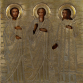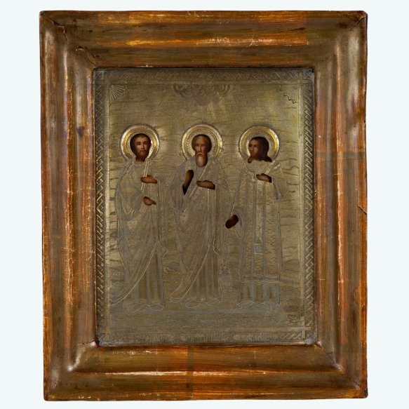 Rússia – Importante ícone com placa de cobre representando 3 santos. Final do século XVIII. Dimensões: 24 x 20 cm.