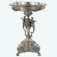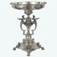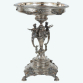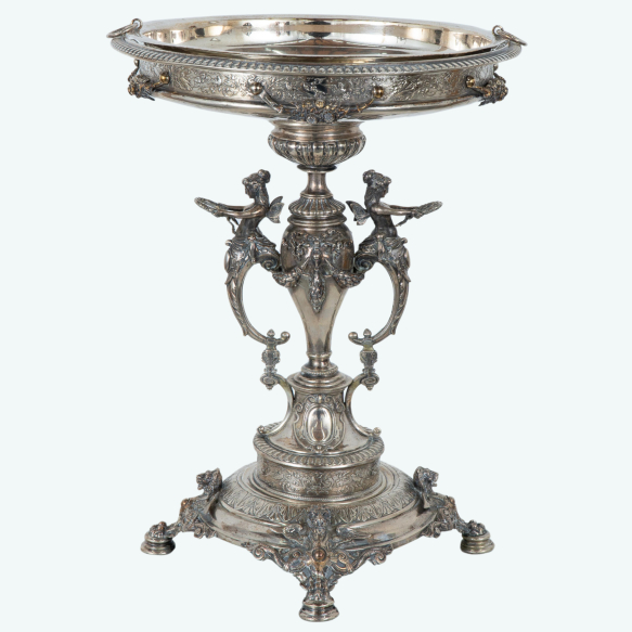 Bruckmann & Sohne - Centro de mesa ou fruteira em prata de lei alemã, batida, repuxada e cinzelada. Fuste abalaustrado e fenestrado por duas figuras femininas zoomorfas, colocadas em posições contrapostas, e segurando uma coroa de folhas de louro em suas mãos. Fuste abalaustrado e lavrado por temática floral arrematado por gomados, elevando prato moldurado por guirlandas entre faisões e composições de frutos. Base circular no mesmo seguimento, repousando sobre quatro pés no feitio de leões alados sobre filas fenestradas em volutas e pés leoninos. Alemanha, séc. XIX. Peso: 2.970 gramas. Dimensões: 44 x ø33 cm.