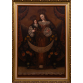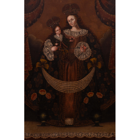 Nossa Senhora de Copacabana com o menino Jesus segurando um orbi, magnífica pintura colonial a óleo sobre tela cusquenha com harmoniosa composição de palmas com flores e rico cortinado carmesin. Todos esses elementos fazem desta obra cusquenha que encanta beleza e harmonia, mas um registro monumental da técnica levado aos píncaros do virtuosismo o que julgamos tratar-se de uma obra de um grande mestre; Peru (América Espanhola), do início do séc. XIX. Dimensões: 120 x 80 cm.