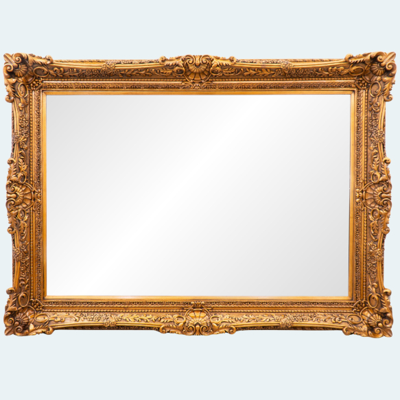 Extraordinário espelho italiano de grandes dimensões ao estilo Luis XVI em madeira nobre de linhas elegantes ricamente entalhado e brunido a ouro de grande qualidade. Meados do século XX. Dimensões: 163 x 225 x 25 cm.(Pertenceu ao estilista italiano Valentino de seu escritório em NYC).