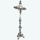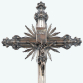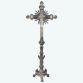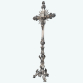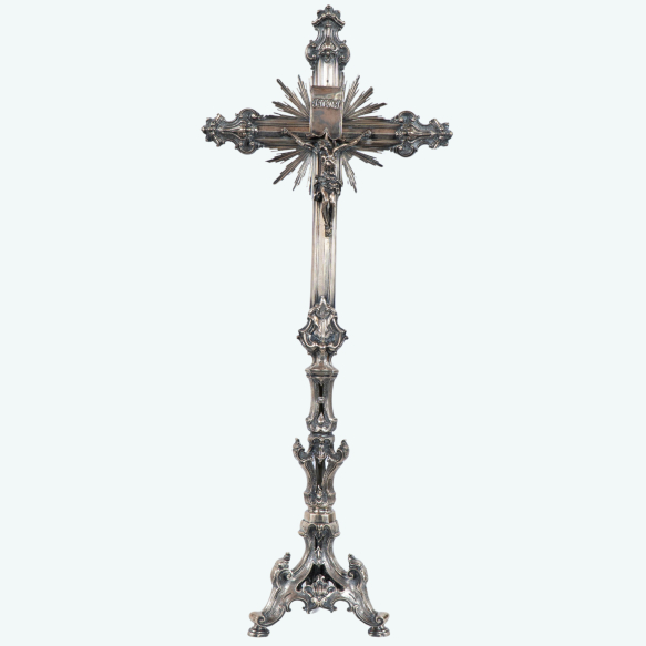 Rara e magnifica cruz brasileira em prata cinzelada e burilada. Apresenta caneluras com três ponteiras lindamente trabalhadas em "rocailles" barrocos. Hastes movimentadas decorada com folhas de acanto sobre base trípode de aba gomada e decoração em harmonia ao conjunto anterior. Sem marcas. Brasil. Séc. XVIII. (Base em conjunto com o lote anterior) Peça de coleção. Alt: 84 cm. Peso: 3.305 gramas.