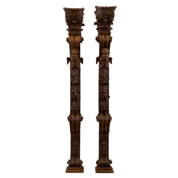 Par de belíssimas colunas de parede Dom José I. Peça em bloco único de madeira possivelmente vinhático, entalhada com florões, enrolamentos, arabescos, cariatides, e parte superior com plumagem. Minas Gerais, Brasil, séc. XVIII. Dimensões: 198 x 23 x 15 cm cada.