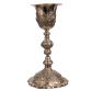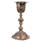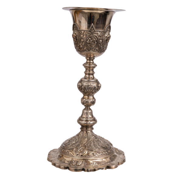 Cálice com patena de prata francesa repuxada, cinzelada e burilada com marcas de “cabeça de minerva”. França, séc. XIX. Peso: 790 gramas. Dimensões: 32 x ø17 cm.