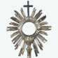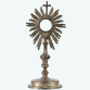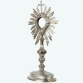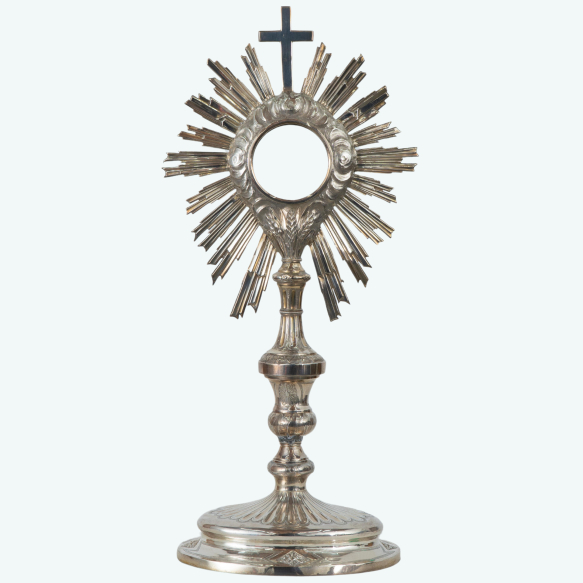 Magnífico e grandioso ostensório, ou custódia, em prata de lei. Hostiário circular com vidros e moldura de nuvens com resplendor raiado e encimado por cruz cinzelada, fuste. Base decorada com elementos da eucaristia e elementos vegetalistas. Marcas na base. Brasil. séc. XIX. Peso bruto: 575 gramas Dimensões: 43 x 17 x 15 cm (Base: 2 x 20 x 13 cm).