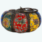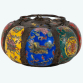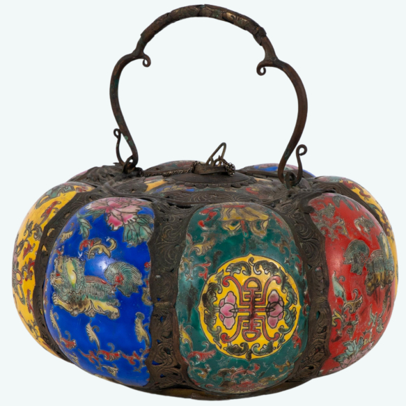 Caixa de ópio chinesa em porcelana esmaltada policromada com bronze do século XIX. O corpo em forma de abóbora com cenas mitológicas e motivos florais e vegetalistas e marcas de caracteres, com hardware montado em metal com padrões furados. Possui uma alça metálica oscilante. Sul da China. Dimensões: 11 x ø20 cm.
