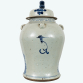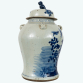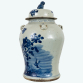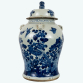 Grande vaso com tampa em porcelaria chinesa ao estilo da Cia. das Índias, decorado com esmaltes azul e branco; China, séc. XXI. Dimensões: 41 x 38 x 38 cm.