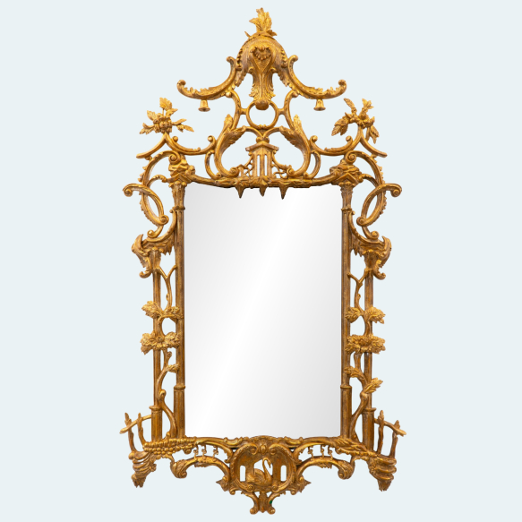 Espelho estilo Inglês em forma de pagode em madeira entalhado e vazado em pintura dourada. Brasil, séc. XX. Apresenta restauro e pequenas falhas na douração. Dimensões: 165 x 90 x 5 cm