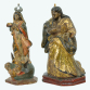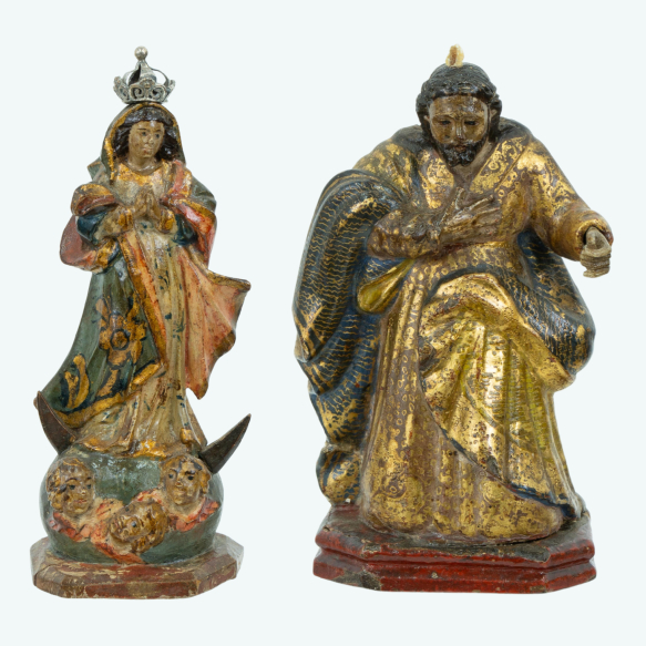 São João Baptista e Nossa Senhora da Conceição – Par de imagens de devoção familiar em madeira entalhada, vazada e policromada. Minas Gerais, Brasil, séc. XVIII. Dimensões: 9 cm de altura cada.
