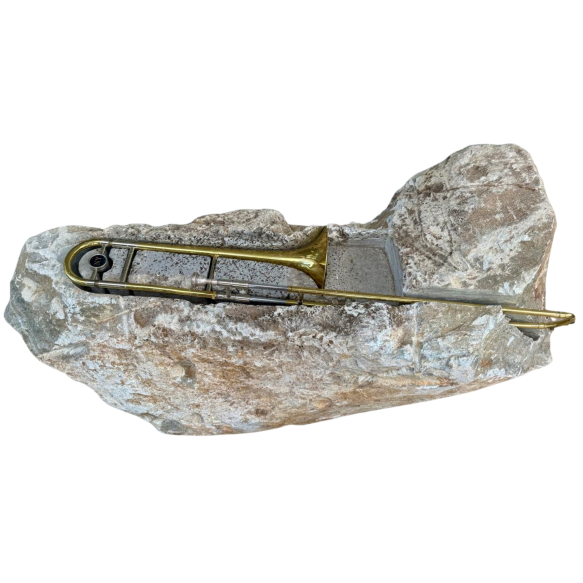 Nuno Ramos - Pagão - Pedra-sabão e instrumento musical - 90 x 150 cm.