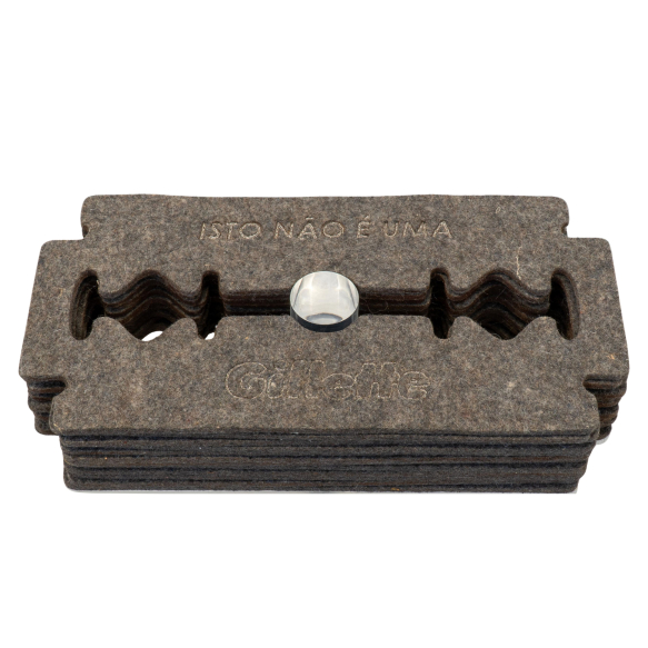 Nazareth Pacheco - Isto não é uma Gillette - 2008 - Feltro e base de acrílico - 6 x 30 x 16 cm. Participou da exposição "Bordando Arte", realizada na Pinacoteca do Estado de São Paulo, em 2008; reproduzido no catálogo da mostra, pp; 53,78.