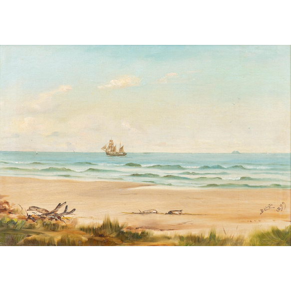 Benedito Calixto - Veleiro no mar - 1899 - Óleo sobre tela - Assinado canto inferior direito - 30 x 44 cm. Participou da exposição "Águas Brasileiras", realizada por SOCIARTE, no Museu de Arte Sacra de São Paulo, em 2024; reproduzido no catálogo da mostra, pág. 22.