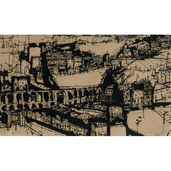 EspañolDarel Valença Lins - Sem título - 1980 - Nanquim sobre cartão - Assinado canto inferior direito - 27 x 44 cm. Moldura executada por Tenreiro Móveis e Decorações.