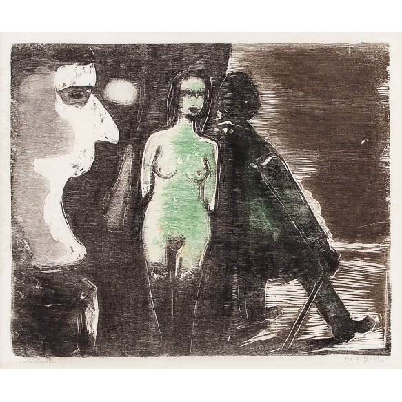 Oswaldo Goeldi - Solitário - Xilogravura aquarelada. - Assinado Inferior direito. - Titulado inferior esquerdo. - 24 x 29 cm.