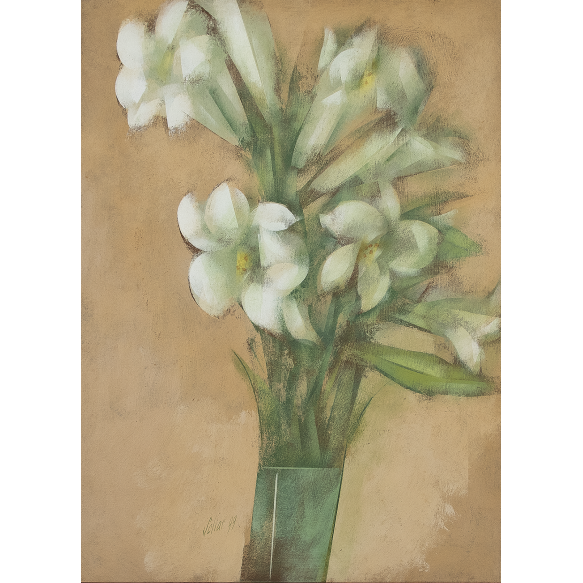 Carlos Scliar - Flores (Lírios) - Vinil encerado sobre tela colada em madeira. - Assinado e datado 99 inferior esquerdo. - Assinado, datado 15/1/99, titulado e situado Cabo Frio - RJ, com dedicatória no verso. - 75 x 55 cm.