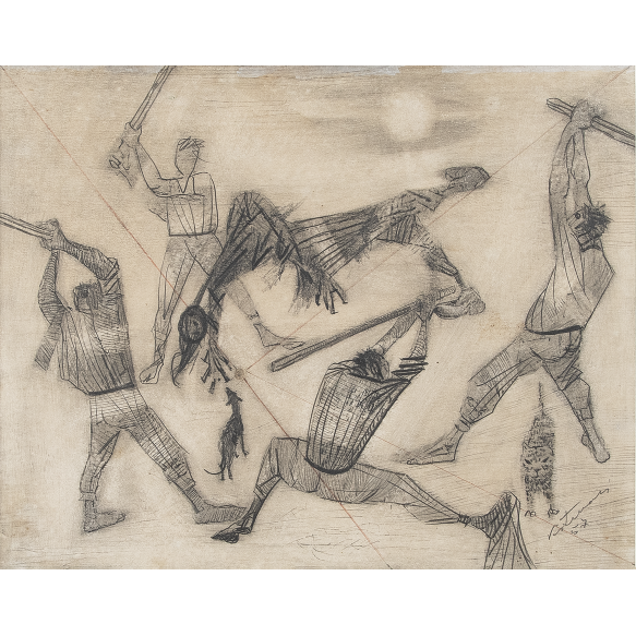 Cândido Portinari - Malhando judas. - Grafite e sanguínea sobre papel. - Assinado e datado 57 inferior direito. - 31 x 39 cm. - Reproduzido nos catálogos: - Raisonné, vol. IV, sob o n. 4231 [fCO 535], p. 307.- Portinari: retrospectiva, de Luiz Hossaka et al. Museu de Arte de São Paulo, SP, 1997, p. 128.- Reproduzido nos livros:- Portinari, apres. Carlos Drummond de Andrade. Cultrix, São Paulo, SP, 1962, p. 35. (mestres do desenho).- Portinari: o menino de Brodósqui. Candido Portinari. Editora Livroarte, Rio de Janeiro, 1979, p. 80.- Brasil: festa popular, de Cáscia Frade et al, Editora Livroarte, Rio de Janeiro, RJ, 1980, p. 216. .