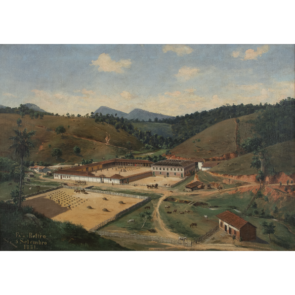 Johann Georg Grimm - Fazenda Retiro. - Óleo sobre tela. - Assinado, datado 5 de Setembro 1881, e titulado inferior esquerdo. - 58 x 83 cm.