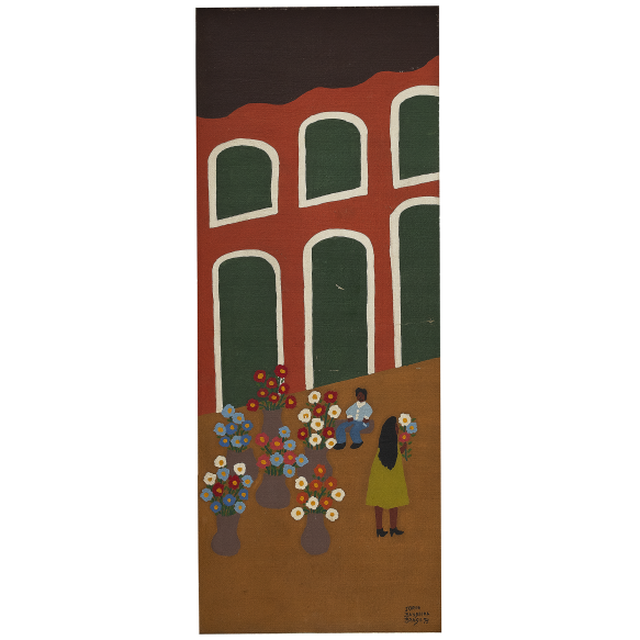 EspañolJorge Bandeira Brasil - Vendedor de flores. - Óleo sobre placa - Assinado e datado 75 inferior direito. - Assinado, datado 75 e titulado no verso. - 80 x 31 cm.