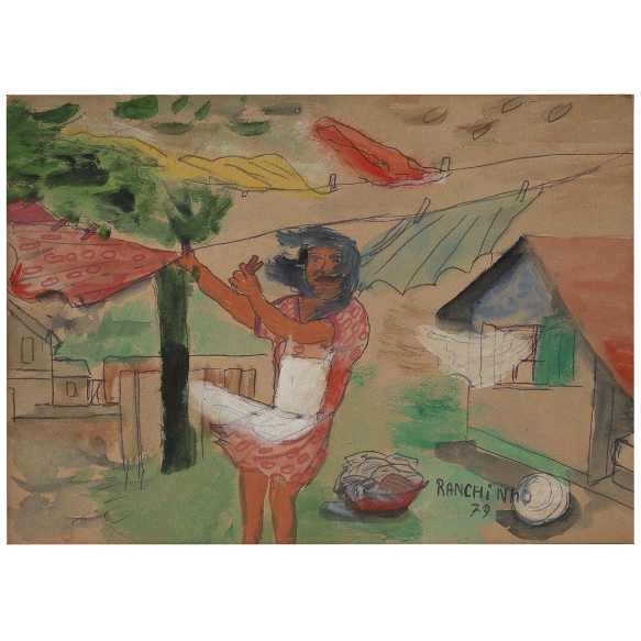 EspañolRanchinho - Lavadeira- Guache e aquarela sobre cartão colado em placa. - Assinado e datado 79 inferior direito. - 33 x 47 cm.