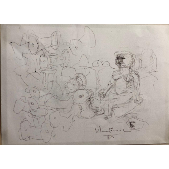 Iberê Camargo - Nu e carretéis - 19 x 25 cm - Desenho a nanquim - Assinatura canto inferior direito e Data 1991 - Ex-coleção Dr.Cezar Bernardi amigo e médico do pintor - Desenho importante do artista e dupla face - Primeiro representa nu e carretéis e no verso da obra apresenta vários estudos de rostos das suas figuras