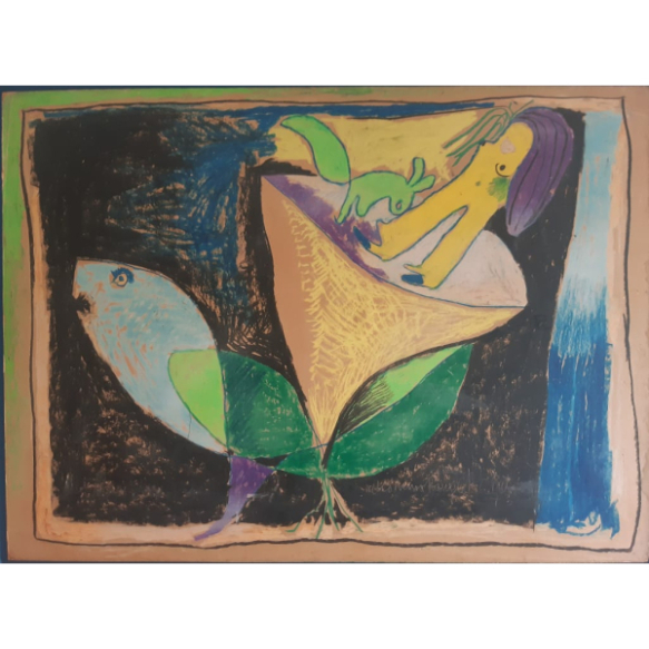 Nello Nuno - Copo de leite e figuras - 57 x 77 cm - Pastel oleoso sobre cartão - Assinado canto inferior direito e Data 1963 - Selo de exposição da Fundação Clóvis Salgado