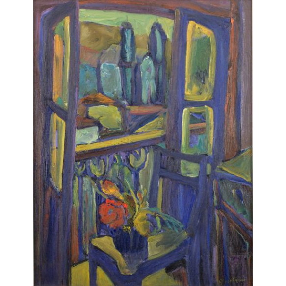 Carlos Bracher - Interior com cadeira e ao fundo Igreja São Francisco de Assis - 80 x 60 cm - Óleo sobre tela - Assinatura canto inferior direito e Data 1968