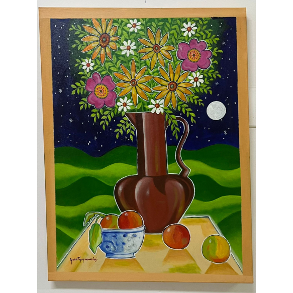 EspañolYara Tupynambá - Flores, natureza morta e noite estrelada com montanhas de Minas - 80 x 60 cm - Acrílica sobre tela - Assinatura canto inferior esquerdo