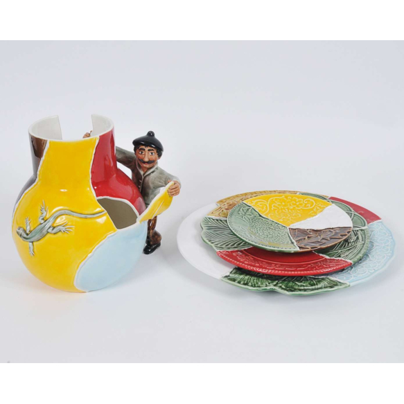 EspañolVik Muniz/Bordello Pinheiro - O colador de cacos - Lote composto por 4 peças em faiança nacional pintada a mão e decorada em relevos sendo, um vaso e três pratos ricamente esmaltados - Tiragem de 250 - Assinatura base