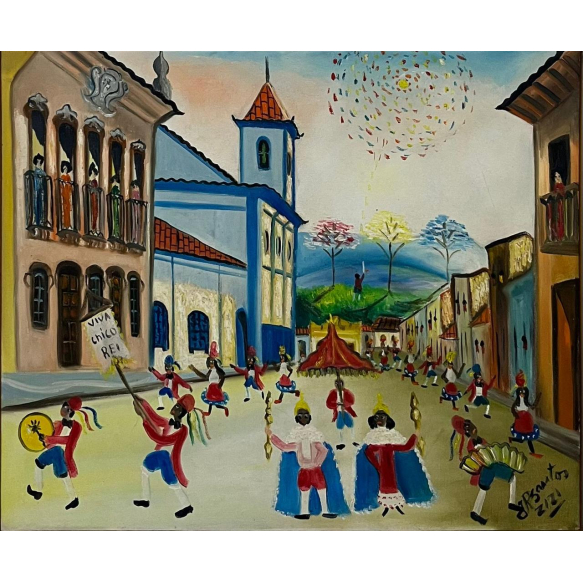 EspañolZizi Sapateiro - Festa do Chico Rei na Primavera e menino soltando fogos - 47 x 56 cm - Óleo sobre tela - Assinatura canto inferior direito