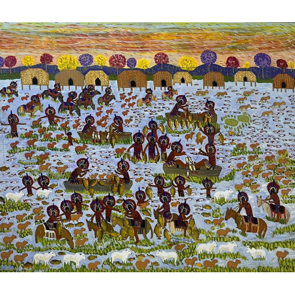 EspañolValques Pimenta - Indígenas caipós, onças, capivaras e bezerros no Pantanal - Mato Grosso - 108 x 127,5 cm - Acrílica sobre tela - Assinatura meio inferior