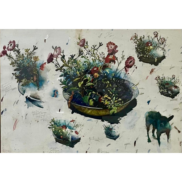 EspañolSérgio Nunes - Flores e Lobo Guará - 66,5 x 96,5 cm - Aquarela e óleo sobre cartão - Assinatura meio inferior - Esta obra participou da individual realizada do artista na Errol Flynn Galeria de Arte