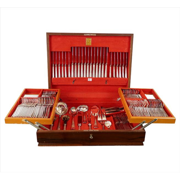 WOLFF, Faqueiro de metal espessurado à prata na caixa original, completo para 12 pessoas, contendo serviço de peixe, sendo 12 facas jantar, 12 garfos, 12 colheres, 12 f. sobremesa, 12g. bs., 12c. sb., 12 g. peixe, 12 g/ peixe e 10 peças de servir, total 106 peças. 14 x 54 x 40cm (caixa)