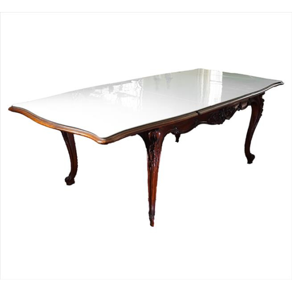 Mesa de jantar de madeira entalhada, ornamentada com guirlandas e rocalhas centrais, pernas ligeiramente recurvas, estrutura extensível com tampo de porcelana. Meados do séc. XX. Alt. 75 x 248 x 110cm. (placa de porcelana no estado)