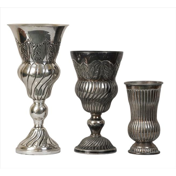 Lote contendo 03 grandes taças / vasos, metal espessurado à prata, ornamentados com caneluras em relevo e motivos florais. Alt. 20 x 09cm (menor) e 36 x 17cm (maior)