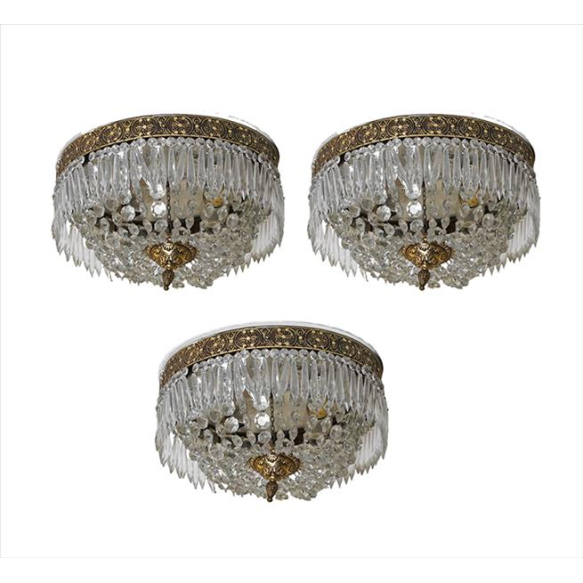 Jogo de 03 plafons/luminárias de teto, estrutura de bronze com contas de cristal lapidado. Alt. 25 x 35cm (aproximadamente). Brasil séc. XX.