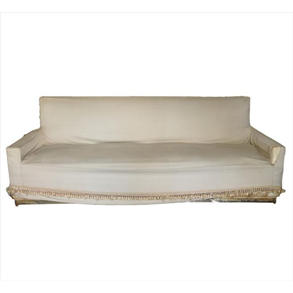 Sofá 04 lugares com estrutura de madeira, forração de tecido fino com cetin, base revestida de folha cromada, acompanha capa de tecido com franjas. Alt. 88 x 243 x 78cm. Brasil, década 60/70 (capa com rasgos)